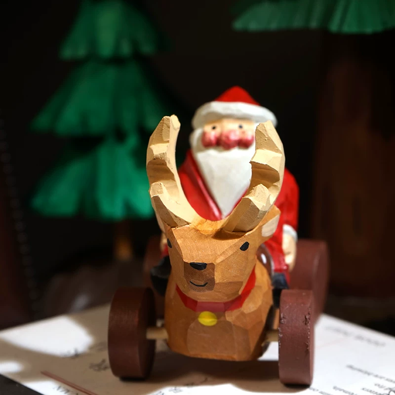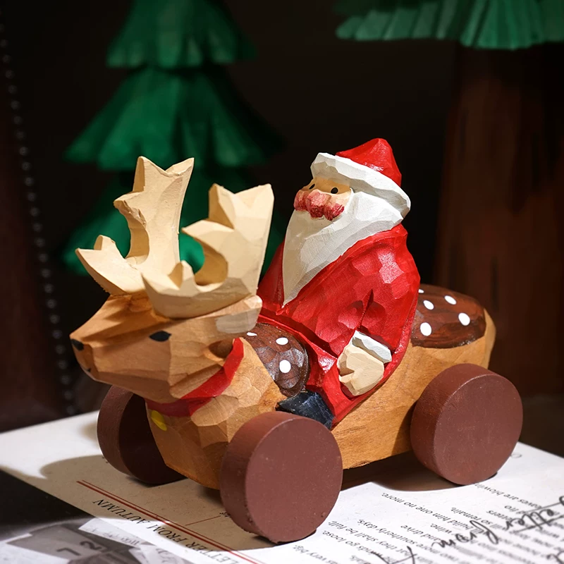 The Joyful Journey: Hand-Carved Wooden Santa on Reindeer Cart – Whimsical Christmas Decor